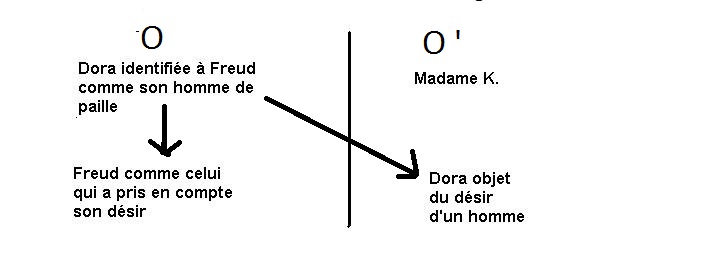 Autrement dit l’important ce n’est pas tellement le fait que Dora s’identifie à Madame K. en O mais que surtout elle puisse passer de l’autre côté du miroir, en O’ comme cause du désir d’un homme.