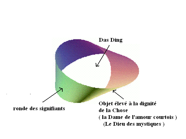 Je peux représenter ce rapport de das Ding au cœur de la ronde des signifiants par un schéma mais à condition de tenir compte du fait qu’il faut transformer ce cercle en bande de Moebius, pour rendre compte du fait que das Ding est à la fois au cœur du sujet mais à l’extérieur et surtout pour pouvoir y inscrire comment des éléments imaginaires peuvent réussir à leurrer le sujet au point même de das Ding. Ce point on peut en effet le représenter comme étant au point même de torsion de la bande de Moebius. C’est en effet en ce point fictif puisque glissant tout au long de la bande, que cet objet peut être élevé à cette dignité de la Chose, c’est en ce point même qu’elle semble la rejoindre.