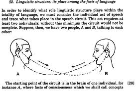 Mais si nous poursuivons la description de ce circuit de la parole, nous pouvons constater comment ils fonctionnent d’emblée les uns avec les autres : «  Supposons qu’un concept donné déclenche dans le cerveau une image acoustique correspondante : c’est un phénomène entièrement psychique, suivi à son tour d’un procès physiologique : le cerveau transmet aux organes de la phonation une impulsion corrélative à l’image. Puis les ondes sonores se propagent de la bouche de A à l’oreille de B : procès purement physique. Ensuite le circuit se prolonge en  ordre inverse de l’oreille au cerveau : transmission physiologique de l’image acoustique ; dans le cerveau association psychique de cette image acoustique avec le concept correspondant ». Pour peu que maintenant l’interlocuteur B veuille répondre, cet acte de parole se renouvellera donc en sens inverse de B vers A. »