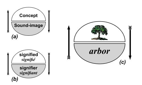 Sur ces schémas saussuriens, l’association signifiant/ signifié peut se faire en double sens. Tantôt c’est le signifié qui précède le signifiant, quand il s’agit d’assurer la phonation, l’émission de la parole, tantôt c’est le signifiant qui précède en tant que condition de l’audition dans ce circuit de la parole. D’ailleurs les doubles flèches du schéma entre c et i, entre le concept et l’image acoustique laissent  présager ce fait.
