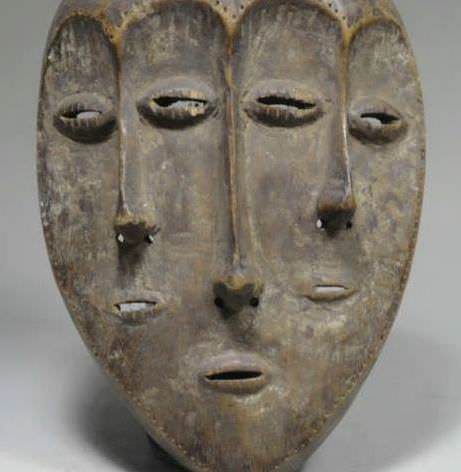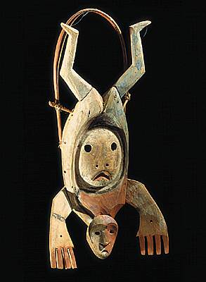 Mais on peut déjà repérer ce lien créé par Lacan entre le masque et l’Idéal du moi tel qu’il le décrit à propos de Gide : « Cette spaltung ou refente du moi, sur quoi la plume de Freud in articulis mortis s’est arrêtée, nous semble bien être ici le phénomène spécifique. Occasion de s’étonner encore que le sens commun des psychanalystes le banisse de toute réflexion méditée […] Faut-il pour éveiller leur attention, leur montrer le maniement d’un masque qui ne démasque la figure qu’il représente qu’à se dédoubler et qui ne la représente qu’à la remasquer ? Leur expliquer de là que c’est quand il est fermé qu’il la compose et quand il est ouvert qu’il la dédouble ». En note Lacan se réfère donc au chapitre de l’Anthropologie structurale qui a pour titre « Le dédoublement de la repésentation dans les arts de l’Asie et de l’Amérique ». C’est curieux, Lévi-Strauss évoque certes le dédoublement du masque par rapport au visage, tatoué ou peint, mais le masque lui même est aussi dédoublé. Celui-là en est un bon exemple3.