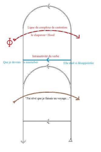 Ce qui me parait en effet important avec le surgissement de ce signifiant Hood, c’est qu’on peut l’inscrire sur ce qui est aussi nommé ligne du complexe de castration et qu’on peut donc le mettre en rapport avec le signifiant phallique. C’est en effet de cela dont il est sans cesse question dans ce rêve.  Cet avocat qui ne pouvait pas plaider était en effet en difficulté avec ce signifiant phallique, entre le fait de l’avoir ou bien de l’être, d’être l’objet phallique de l’Autre comme en témoigne son fantasme : « Elle attrapait son pénis pour se l’introduire ».  Il est son objet phallique.
